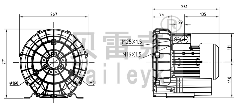 最大風量:100m3/h 最大正壓:120mbar 最大負壓:110mbar 防護等級:IP55 噪音:55db 重量:11Kg |